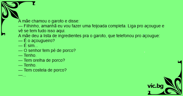 — Filhinho, amanhã eu vou fazer uma feijoada completa. Liga pro açougue e vê se tem tudo isso aqui.