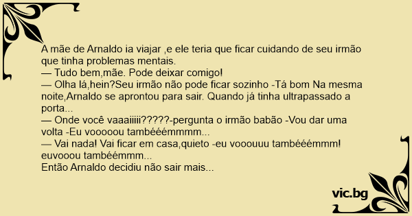 — Olha lá,hein?Seu irmão não pode ficar sozinho -Tá bom Na mesma noite,Arnaldo se aprontou para sair. Quando já tinha ultrapassado a porta...