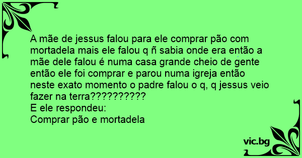 A mãe de jessus falou para ele comprar pão com mortadela mais ele falou q ñ sabia onde era então a mãe dele falou é numa casa grande cheio de gente então ele foi comprar e parou numa igreja então neste exato momento o padre falou o q, q jessus veio fazer na terra??????????