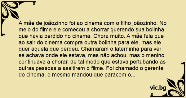 A mãe de joãozinho foi ao cinema com o filho joãozinho. No meio do filme ele comecou a chorrar querendo sua bolinha que havia perdido no cinema. Chora muito. A mãe fala que ao sair do cinema compra outra bolinha para ele, mas ele quer aquela que perdeu. Chamaram o laterninha para ver se achava onde ele estava, mas não achou, mas o menino continuava a chorar, de tal modo que estava pertubando as outras pessoas a assitirem o filme. Foi chamado o gerente do cinema, o mesmo mandou que paracem o filme e acende-se as luzes para achar a bolinha que havia perdido. Depois de muito procurar sem encontrar a Mãe do menino falou:
