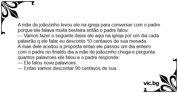 A mae dele aceitou a proposta entao ele passou um dia enteiro com o padre no finaldo dia a mãe de joãozinho chega e pergunta quantos palavroes ele falou e o padre responde: