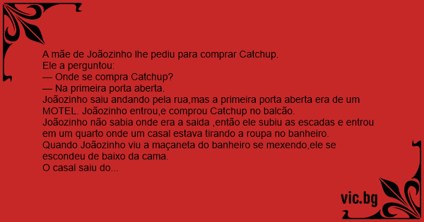Joãozinho saiu andando pela rua,mas a primeira porta aberta era de um MOTEL. Joãozinho entrou,e comprou Catchup no balcão.