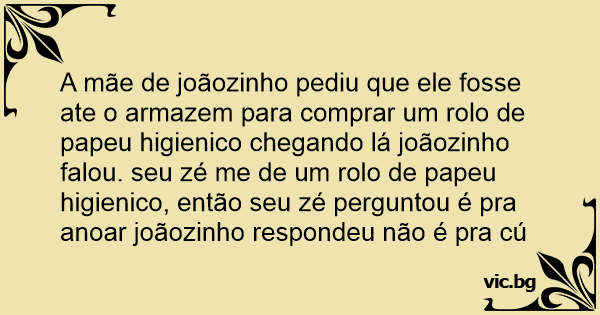 A mãe de joãozinho pediu que ele fosse ate o armazem para comprar um rolo de papeu higienico chegando lá joãozinho falou. seu zé me de um rolo de papeu higienico, então seu zé perguntou é pra anoar joãozinho respondeu não é pra cú