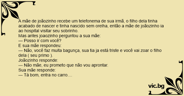 A mãe de joãozinho recebe um telefonema de sua irmã, o filho dela tinha acabado de nascer e tinha nascido sem orelha, então a mãe de joãozinho ia ao hospital visitar seu sobrinho.