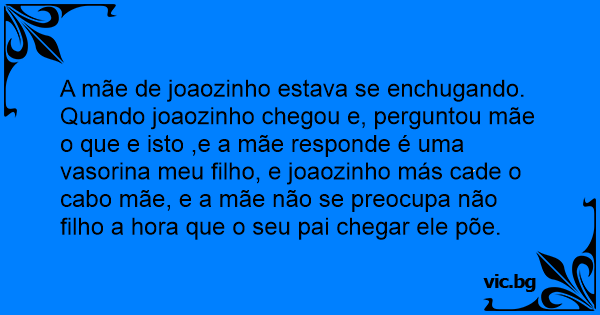 Quando joaozinho chegou e, perguntou mãe o que e isto ,e a mãe responde é uma vasorina meu filho, e joaozinho más cade o cabo mãe, e a mãe não se preocupa não filho a hоrа que o seu pai chegar ele põe.