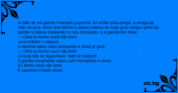 A mãe de um garoto chamado juquinha, foi vizitar uma amiga. a amiga da mãe de juca, tinha uma filinha q usava cadeira de roda juca chegou perto da garota q estava invejando co ceu brinquedo. e a garota lhe disse :