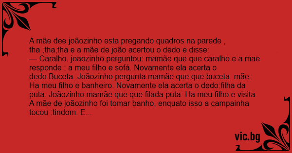 — Саrаlhо. joaozinho perguntou: mamãe que que саrаlhо e a mae responde : a meu filho e sofá. Novamente ela acerta o dedo:Вuсета. Joãozinho pergunta:mamãe que que вuсета. mãe: Ha meu filho e banheiro. Novamente ela acerta o dedo:filha da рuта. Joãozinho:mamãe que que filada рuта: Ha meu filho e visita.