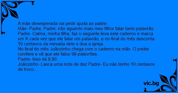 Padre- Calma, minha filha, faz o seguinte leva este caderno e marca um X cada vez que ele falar um palavrão, e no final do mês desconta 10 centavos da mesada dele e doa a igreja.