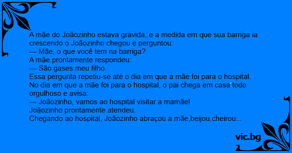 A mãe do Joãozinho estava grávida, e a medida em que sua barriga ia crescendo o Joãozinho chegou e perguntou: