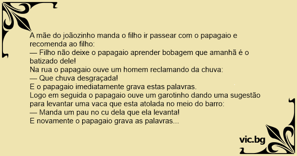 A mãe do joãozinho manda o filho ir passear com o papagaio e recomenda ao filho: