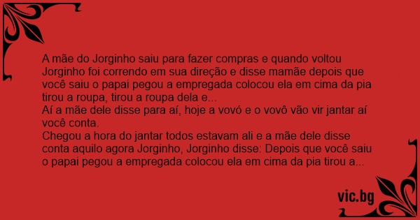 A mãe do Jorginho saiu para fazer compras e quando voltou Jorginho foi correndo em sua direção e disse mamãe depois que você saiu o papai pegou a empregada colocou ela em cima da pia tirou a roupa, tirou a roupa dela e...