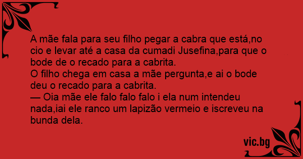 O filho chega em casa a mãe pergunta,e ai o bode deu o recado para a cabrita.