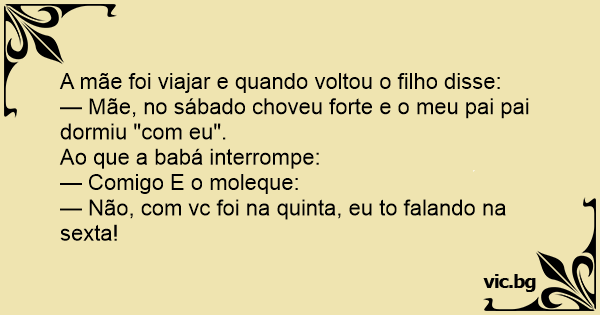 — Mãe, no sábado choveu forte e o meu pai pai dormiu "com eu".
