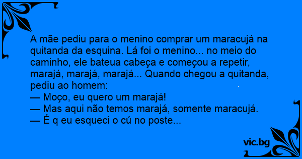A mãe pediu para o menino comprar um maracujá na quitanda da esquina. Lá foi o menino... no meio do caminho, ele bateua cabeça e começou a repetir, marajá, marajá, marajá... Quando chegou a quitanda, pediu ao homem: