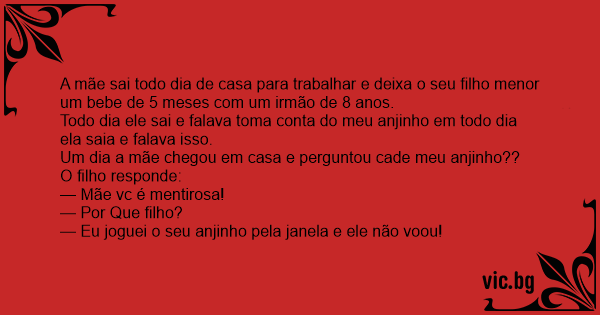 O menino vem correndo e diz à mãe: — Mãe, você é uma mentirosa! — Mais por que você diz isso meu filho? — Você disse que meu irmãozinho era um anjo! Eu joguei ele pela janela e ele não voou...