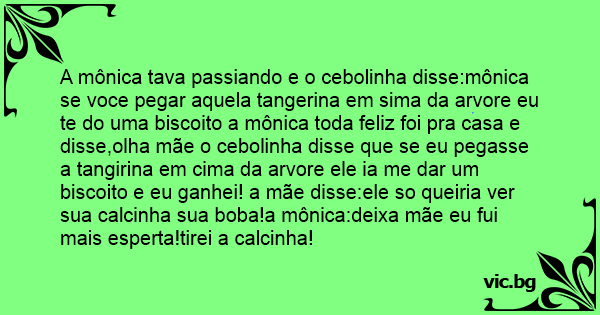 A mônica tava passiando e o cebolinha disse:mônica se voce pegar aquela tangerina em sima da arvore eu te do uma biscoito a mônica toda feliz foi pra casa e disse,olha mãe o cebolinha disse que se eu pegasse a tangirina em cima da arvore ele ia me dar um biscoito e eu ganhei! a mãe disse:ele so queiria ver sua calcinha sua boba!a mônica:deixa mãe eu fui mais esperta!tirei a calcinha!