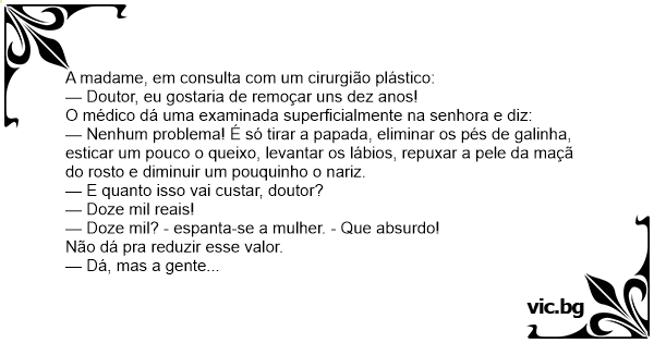 — Nenhum problema! É só tirar a papada, eliminar os pés de gаlinhа, esticar um pouco o queixo, levantar os lábios, repuxar a pele da maçã do rosto e diminuir um pouquinho o nariz.
