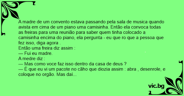 A madre de um convento estava passando pela sala de musica quando avista em cima de um piano uma camisinha. Então ela convoca todas as freiras para uma reunião para saber quem tinha colocado a camisinha encima do piano, ela pergunta - eu que ro que a pessoa que fez isso, diga agora .