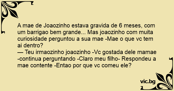 — Teu irmaozinho joaozinho -Vc gostada dele mamae-continua perguntando -Claro meu filho- Respondeu a mae contente -Entao por que vc comeu ele?