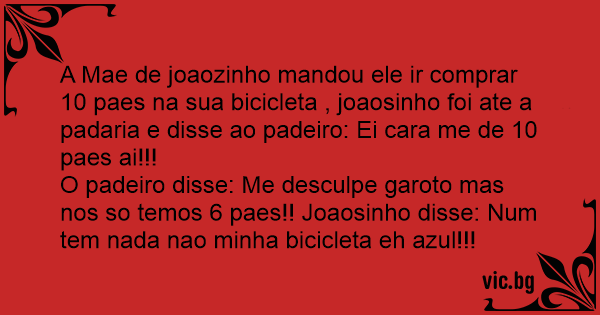 A Mae de joaozinho mandou ele ir comprar 10 paes na sua bicicleta , joaosinho foi ate a padaria e disse ao padeiro: Ei cara me de 10 paes ai!!!