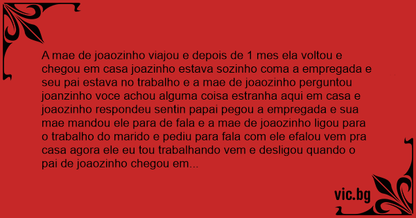 A mae de joaozinho viajou e depois de 1 mes ela voltou e chegou em casa joazinho estava sozinho coma a empregada e seu pai estava no trabalho e a mae de joaozinho perguntou joanzinho voce achou alguma coisa estranha aqui em casa e joaozinho respondeu sentin papai pegou a empregada e sua mae mandou ele para de fala e a mae de joaozinho ligou para o trabalho do marido e pediu para fala com ele efalou vem pra casa agora ele eu tou trabalhando vem e desligou quando o pai de joaozinho chegou em casa e sua mae mandou ele continua e joaozinho falou papai pegou a empregada levou ela pro quarto e fez a mesma coisa que voce fez com o titio fudeu...