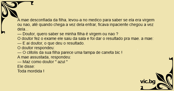 A mae desconfiada da filha, levou-a no medico para saber se ela era virgem ou nao, até quando chega a vez dela entrar, ficava inpaciente chegou a vez dela...