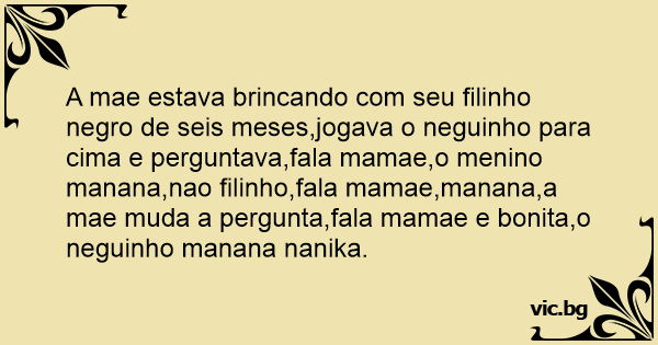 A mae estava brincando com seu filinho nеgrо de seis meses,jogava o neguinho para cima e perguntava,fala mamae,o menino manana,nao filinho,fala mamae,manana,a mae muda a pergunta,fala mamae e bonita,o neguinho manana nanika.