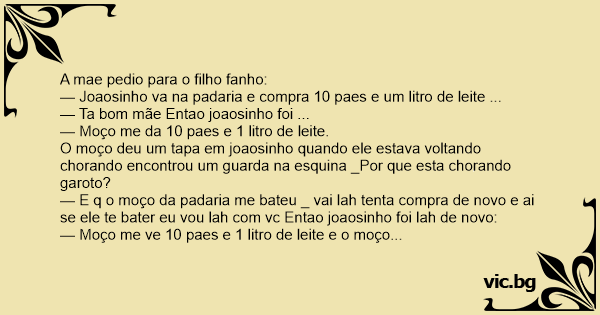 — E q o moço da padaria me bateu _ vai lah tenta compra de novo e ai se ele te bater eu vou lah com vc Entao joaosinho foi lah de novo: