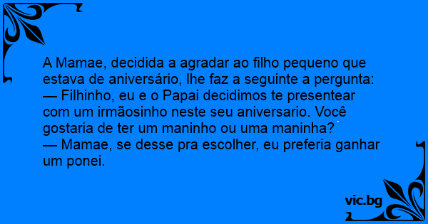 — Filhinho, eu e o Papai decidimos te presentear com um irmãosinho neste seu aniversario. Você gostaria de ter um maninho ou uma maninha?
