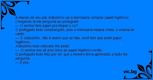 A mando de seu pai Joãozinho vai a mercearia comprar papel higiênico. Chegando lá ele pergunta ao português: