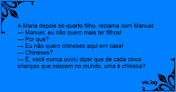 — É, você nunca ouviu dizer que de cada cinco crianças que nascem no mundo, uma é chinesa?