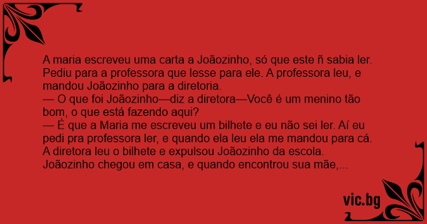 A maria escreveu uma carta a Joãozinho, só que este ñ sabia ler. Pediu para a professora que lesse para ele. A professora leu, e mandou Joãozinho para a diretoria.