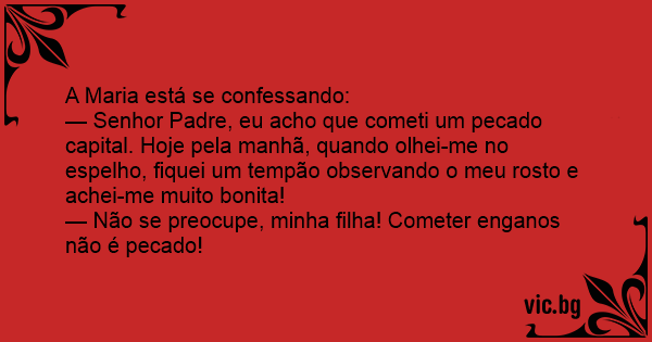 — Senhor Padre, eu acho que cometi um pecado capital. Hoje pela manhã, quando olhei-me no espelho, fiquei um tempão observando o meu rosto e achei-me muito bonita!