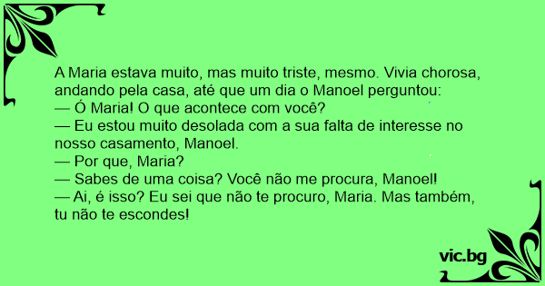 A Maria estava muito, mas muito triste, mesmo. Vivia chorosa, andando pela casa, até que um dia o Manoel perguntou: