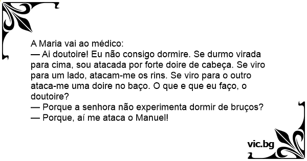 — Ai doutoire! Eu não consigo dormire. Se durmo virada para cima, sou atacada por forte doire de cabeça. Se viro para um lado, atacam-me os rins. Se viro para o outro ataca-me uma doire no baço. O que e que eu faço, o doutoire?