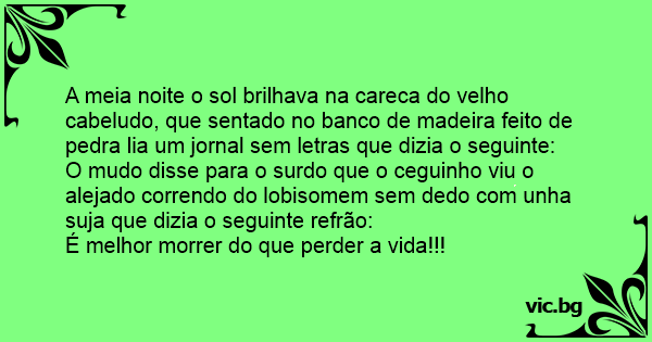 O mudo disse para o surdo que o ceguinho viu o alejado correndo do lobisomem sem dedo com unha suja que dizia o seguinte refrão: