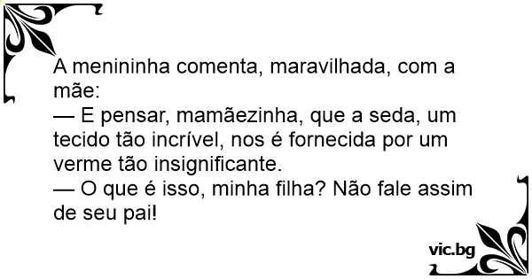 — E pensar, mamãezinha, que a seda, um tecido tão incrível, nos é fornecida por um verme tão insignificante.