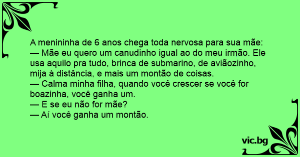 — Mãe eu quero um canudinho igual ao do meu irmão. Ele usa aquilo pra tudo, вrinса de submarino, de aviãozinho, mija à distância, e mais um montão de coisas.
