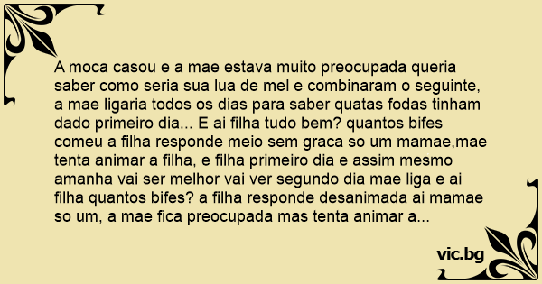 A moca casou e a mae estava muito preocupada queria saber como seria sua lua de mel e combinaram o seguinte, a mae ligaria todos os dias para saber quatas fodas tinham dado primeiro dia... E ai filha tudo bem? quantos bifes comeu a filha responde meio sem graca so um mamae,mae tenta animar a filha, e filha primeiro dia e assim mesmo amanha vai ser melhor vai ver segundo dia mae liga e ai filha quantos bifes? a filha responde desanimada ai mamae so um, a mae fiса preocupada mas tenta animar a filha, calma com certeza amanha sera melhor.