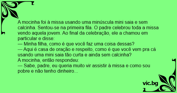 — Sabe, padre, eu queria muito vir assistir à missa e como sou pobre e não tenho dinheiro pra comprar calcinha, eu vim assim mesmo.