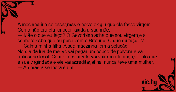 — Mãe,o que eu faço? O Gevorbino acha que sou virgem,e a senhora sabe que eu perdi com o Brofúrio. O que eu faço...?
