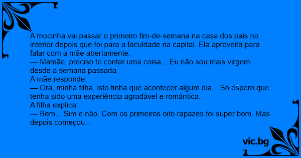 — Mamãe, preciso te contar uma coisa... Eu não sou mais virgem desde a semana passada.
