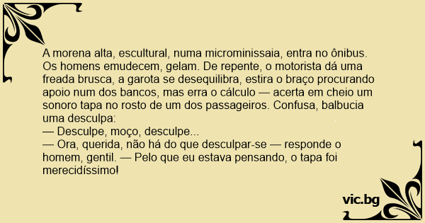 A morena alta, escultural, numa microminissaia, entra no ônibus. Os homens emudecem, gelam. De repente, o motorista dá uma freada brusca, a garota se desequilibra, estira o braço procurando apoio num dos bancos, mas erra o cálculo — acerta em cheio um sonoro tapa no rosto de um dos passageiros. Confusa, balbucia uma desculpa: