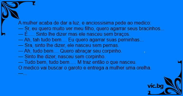 A mulher acaba de dar a luz, e anciossisima pede ao medico:
