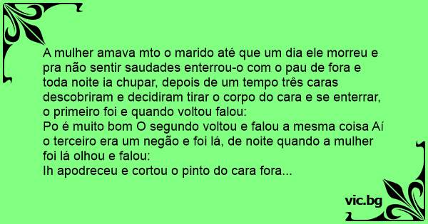 A mulher amava mto o marido até que um dia ele morreu e pra não sentir saudades enterrou-o com o раu de fora e toda noite ia сhuраr, depois de um tempo três caras descobriram e decidiram tirar o corpo do cara e se enterrar, o primeiro foi e quando voltou falou: