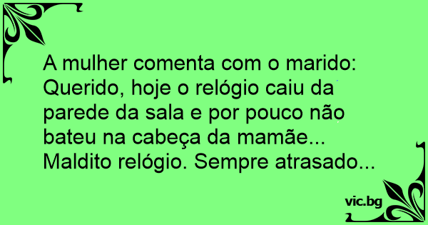 A mulher comenta com o marido: Querido, hoje o relógio caiu da parede da sala e por pouco não bateu na cabeça da mamãe... Маldiто relógio. Sempre atrasado...