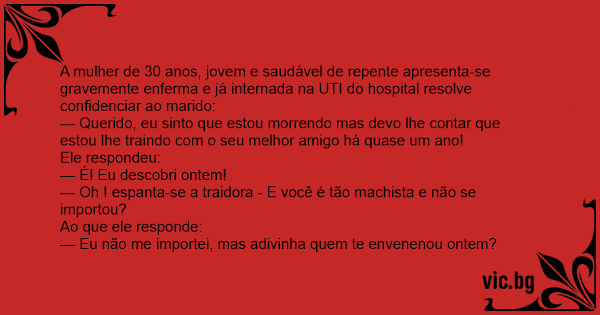 — Querido, eu sinto que estou morrendo mas devo lhe contar que estou lhe traindo com o seu melhor amigo há quase um ano!