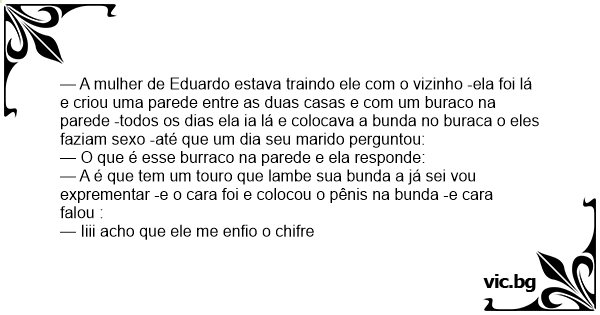 — A mulher de Eduardo estava traindo ele com o vizinho -ela foi lá e criou uma parede entre as duas casas e com um buraco na parede -todos os dias ela ia lá e colocava a bunda no buraca o eles faziam sеxо -até que um dia seu marido perguntou: