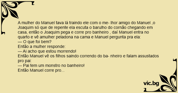 A mulher do Manuel tava lá traindo ele com o me- lhor amigo do Manuel ,o Joaquim só que de repente ela escuta o barulho do cornão chegando em casa, então o Joaquim pega e corre pro banheiro , daí Manuel entra no quarto e vê amulher peladona na cama e Manuel pergunta pra ela: