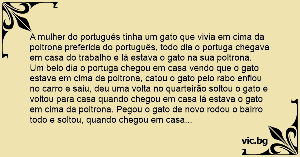 A mulher do português tinha um gato que vivia em cima da poltrona preferida do português, todo dia o portuga chegava em casa do trabalho e lá estava o gato na sua poltrona.
